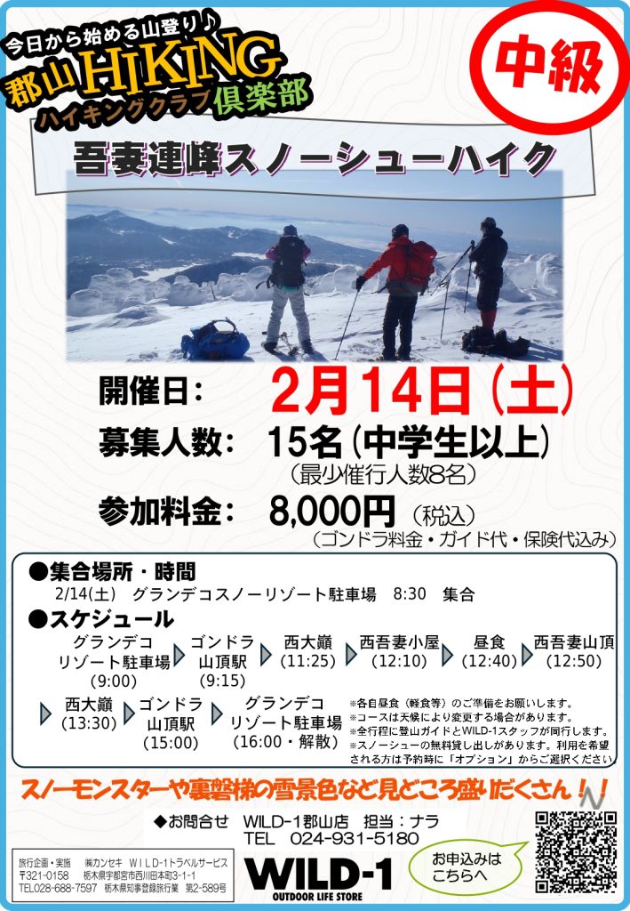 雪が十分に積もってスノーアクティビティがハイシーズンとなる1月に、 五色沼周辺を歩くスノーシュートレッキングイベントを実施します! 五色沼は1888年に磐梯山が水蒸気噴火したことで形成された湖沼群です。 その景観の美しさから新緑や紅葉のシー […]