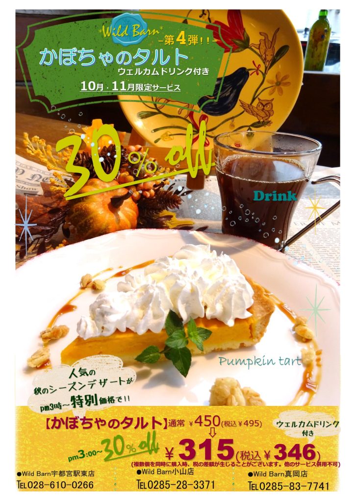 Wild Barn企画 第4弾 【かぼちゃのタルト ウェルカムドリンク付き】30%OFF!!(15時~)