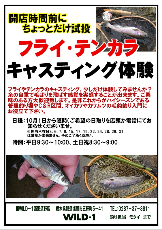秋は管理釣り場やキャッチ&リリース区間、オイカワやカワムツなどの 小物釣りなど、様々な釣りもののベストシーズンです。 この機会にフライフィッシングやテンカラにご興味のあるお客様に向けて、 無料のキャスティング体験を募集いたします。 時間は当 […]